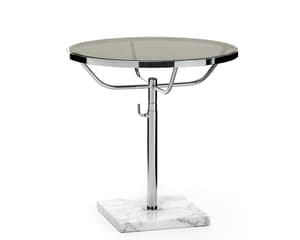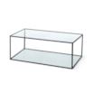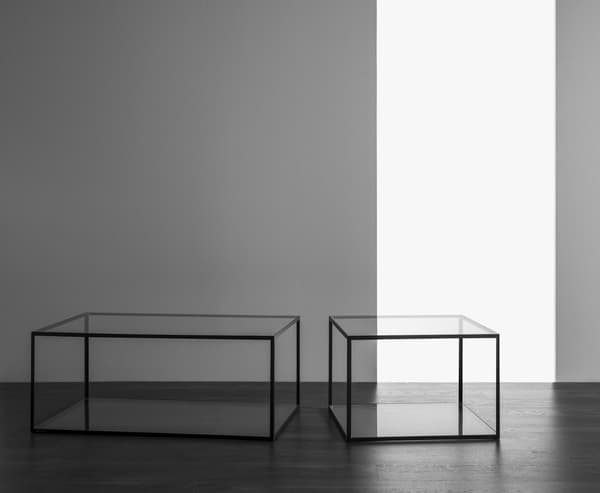 A classic table with a square shape in chrome or black metal, with a glass top and bottom.