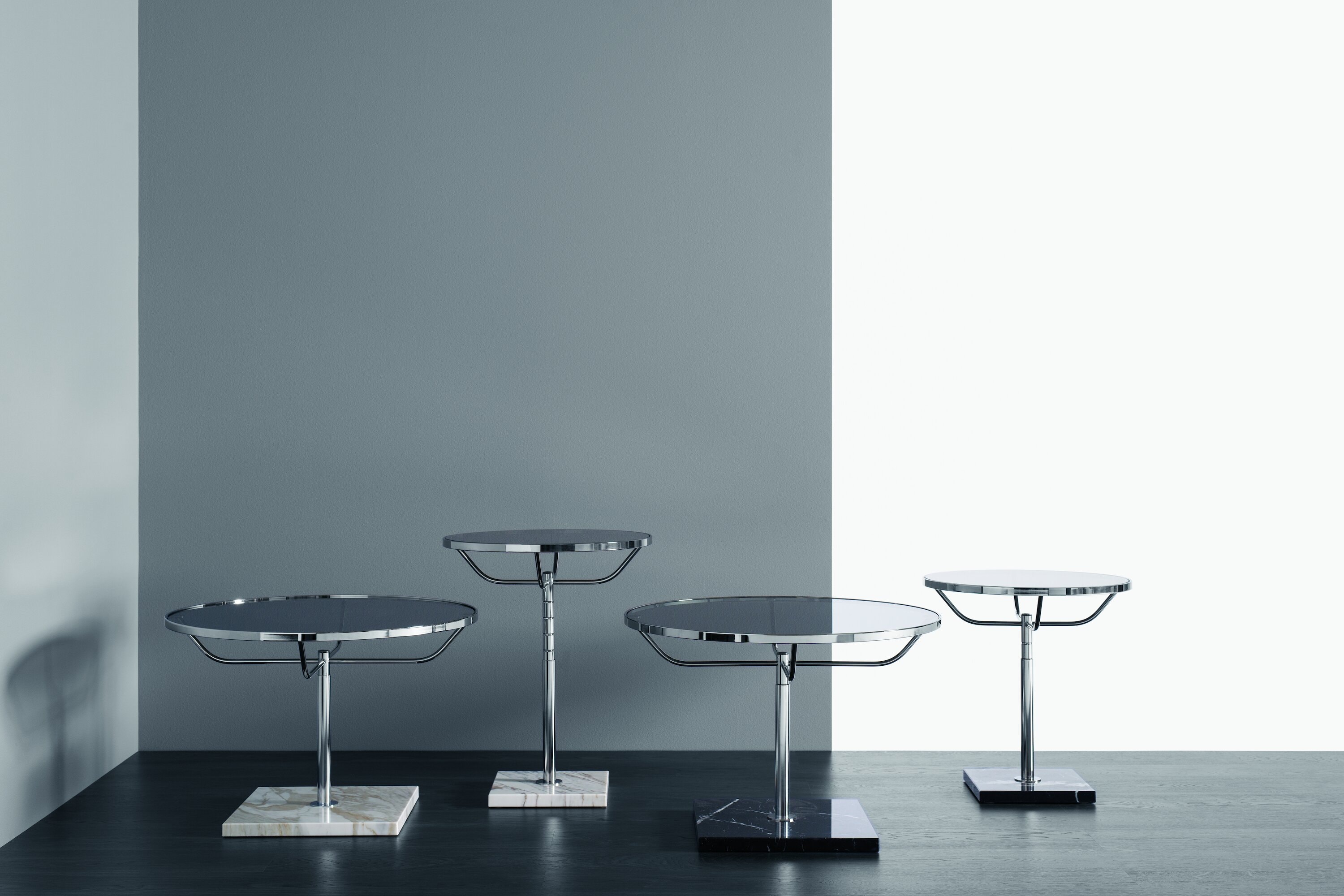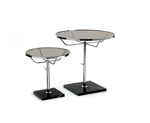 A classic round table in chrome, with a larger top diameter than its smaller counterpart. Featuring manual height adjustment and a marble base.