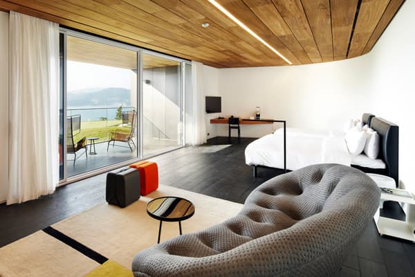 South Cape Spa and Suites is a resort complex facing the South Sea on the Korean Peninsula, where you can also enjoy playing golf. This luxury resort, which is open to the sea, offers guests the ultimate in relaxation. The concrete walls undulate like waves along the building, creating a dynamic appearance that makes it seem to float in the sky. Guest rooms are furnished with DUX beds and Ligne Roset furnishings, and you can enjoy a Geneva sound system. In addition, the rooms feature Aesop amenities. Don't miss the rare pianos and artwork scattered throughout the building.
